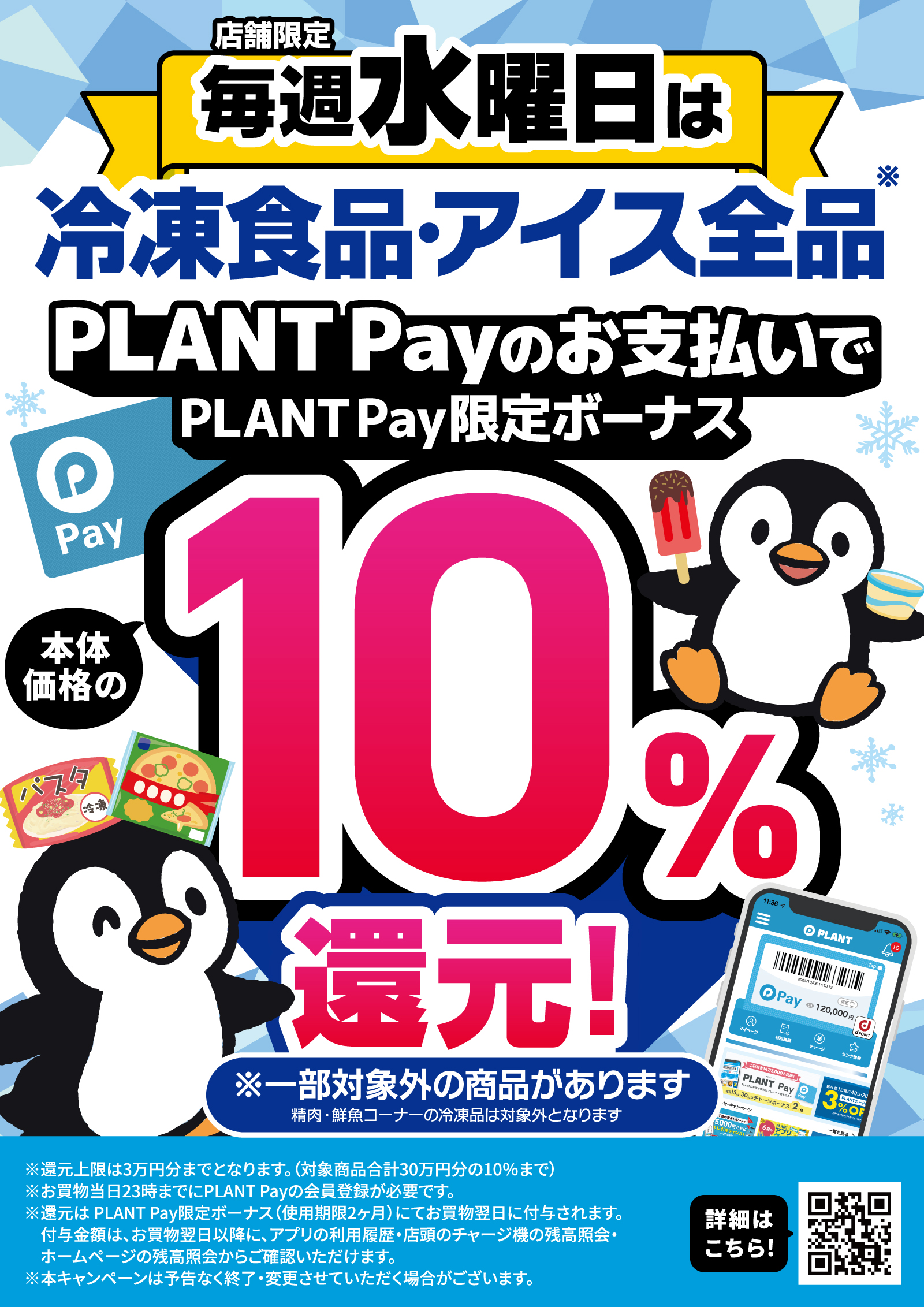 毎週水曜日はPLANT Payのお支払いで冷凍食品・アイス全品ご購入いただくと、購入金額(本体価格)の10%を翌日PLANTPay限定ボーナスにて還元します。