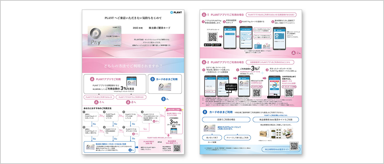 また、「株主様ご優待カード(PLANT Payカード)」は、株主様ご自身が追加チャージすることで継続して利用できるプリペイドカードとなっております。PLANT Payカードの概要は、下記の当社ホームページでご確認をお願いいたします。