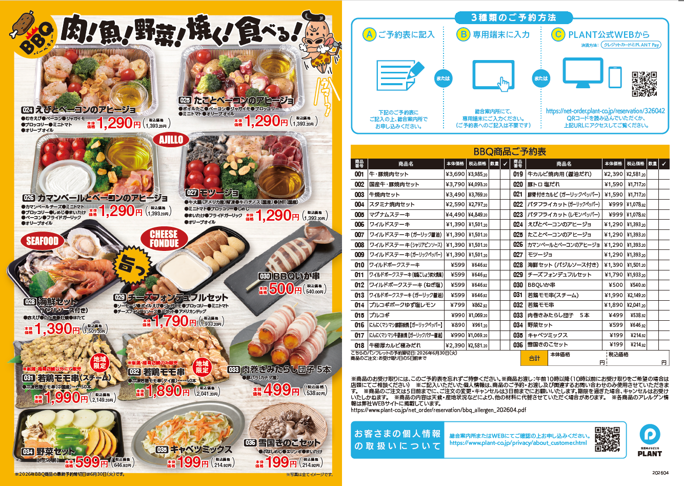 行楽シーズンを迎え、ご家族や友人とBBQを楽しむ機会が増える中、事前にご予約いただくことで、必要な食材を確実にお受け取りいただけるほか、混雑が予想される時期においても、計画的にBBQの準備を進めていただけます。