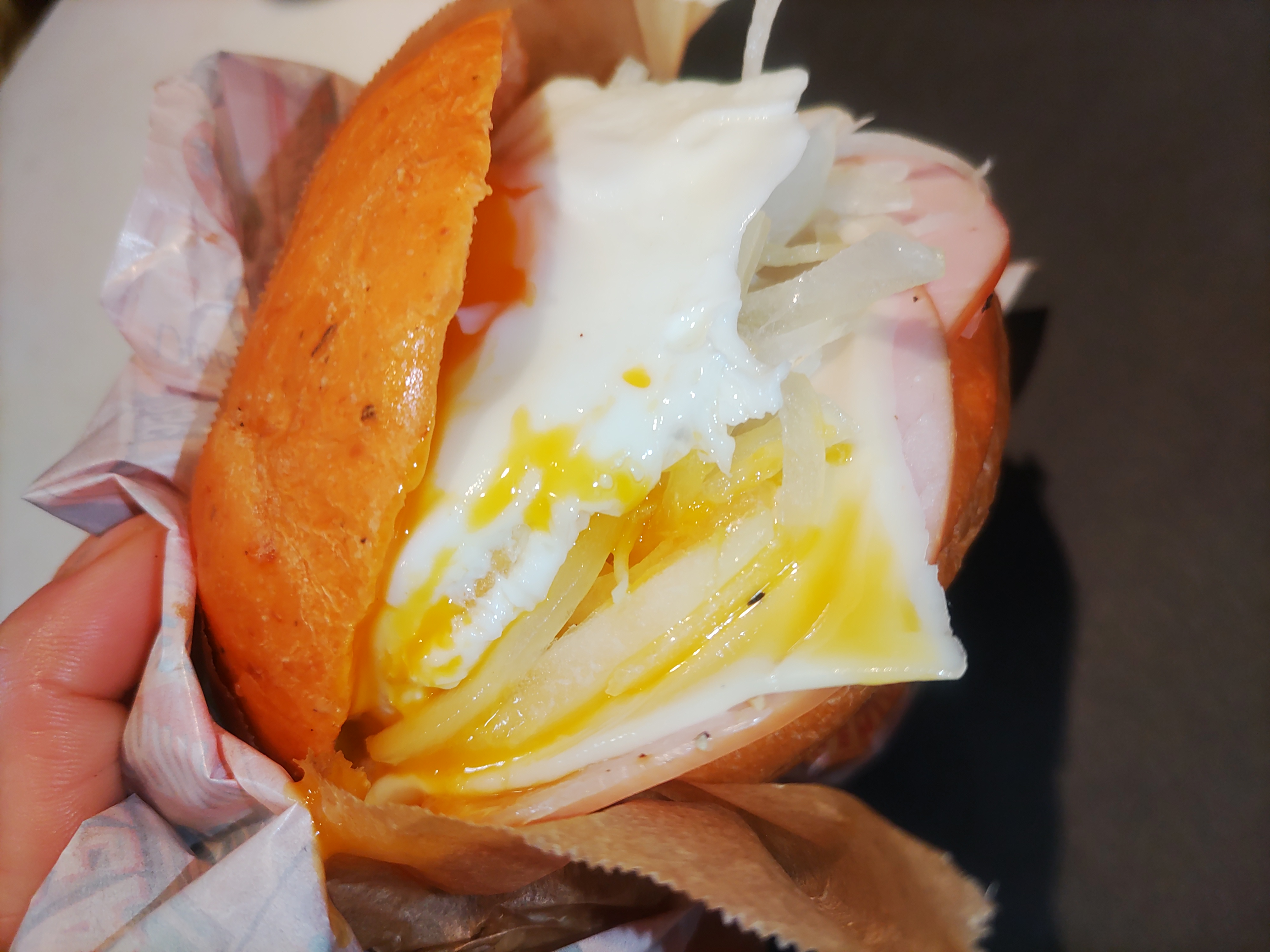 ベーグルにうってつけな『ハム・玉ねぎ・半熟タマゴ(半熟目玉焼き)』を使用した