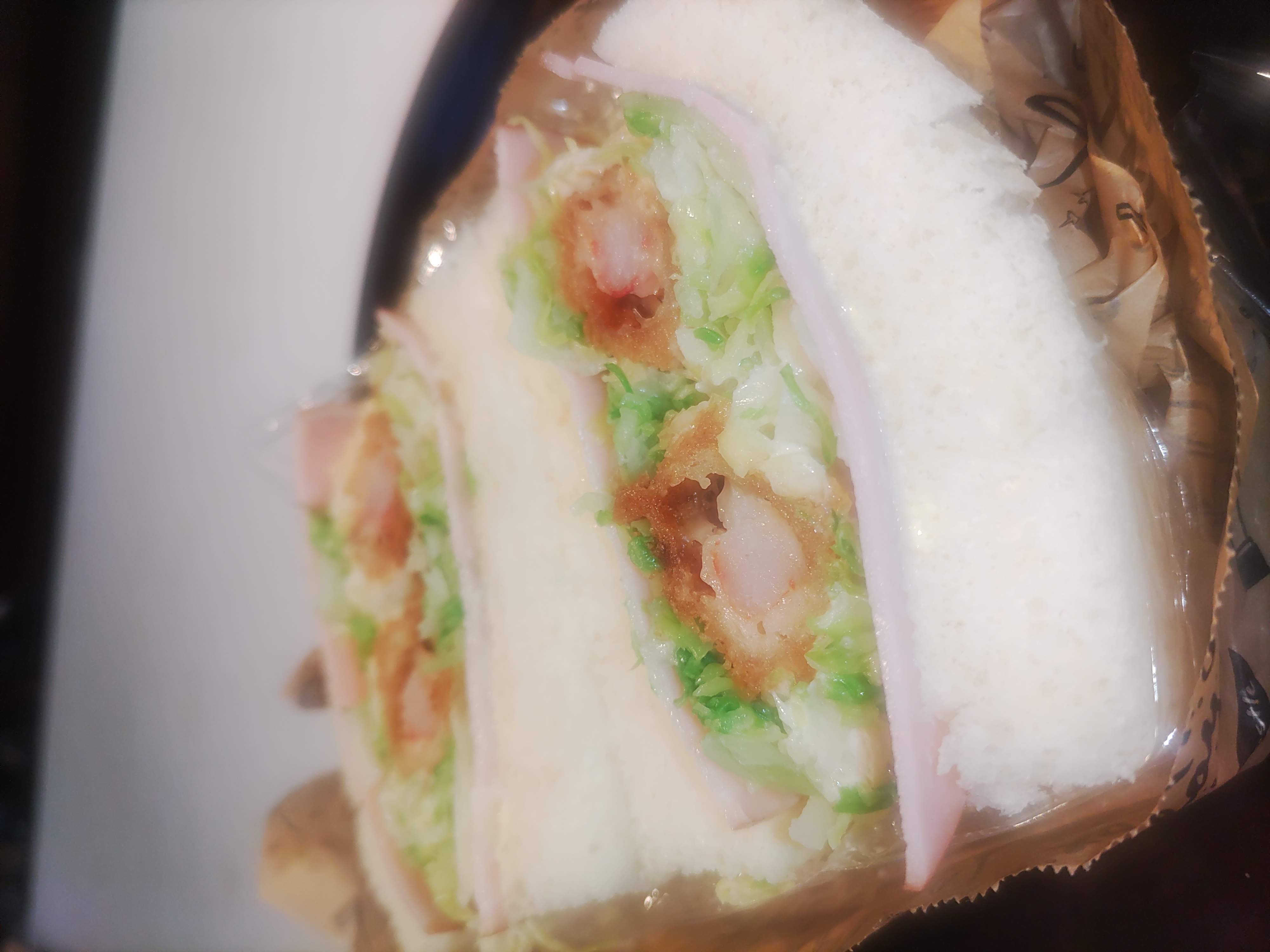 ふわふわのホテル食パンと甘い春キャベツ・サクサクに揚がったエビフライが、んもう~ウマウマです。