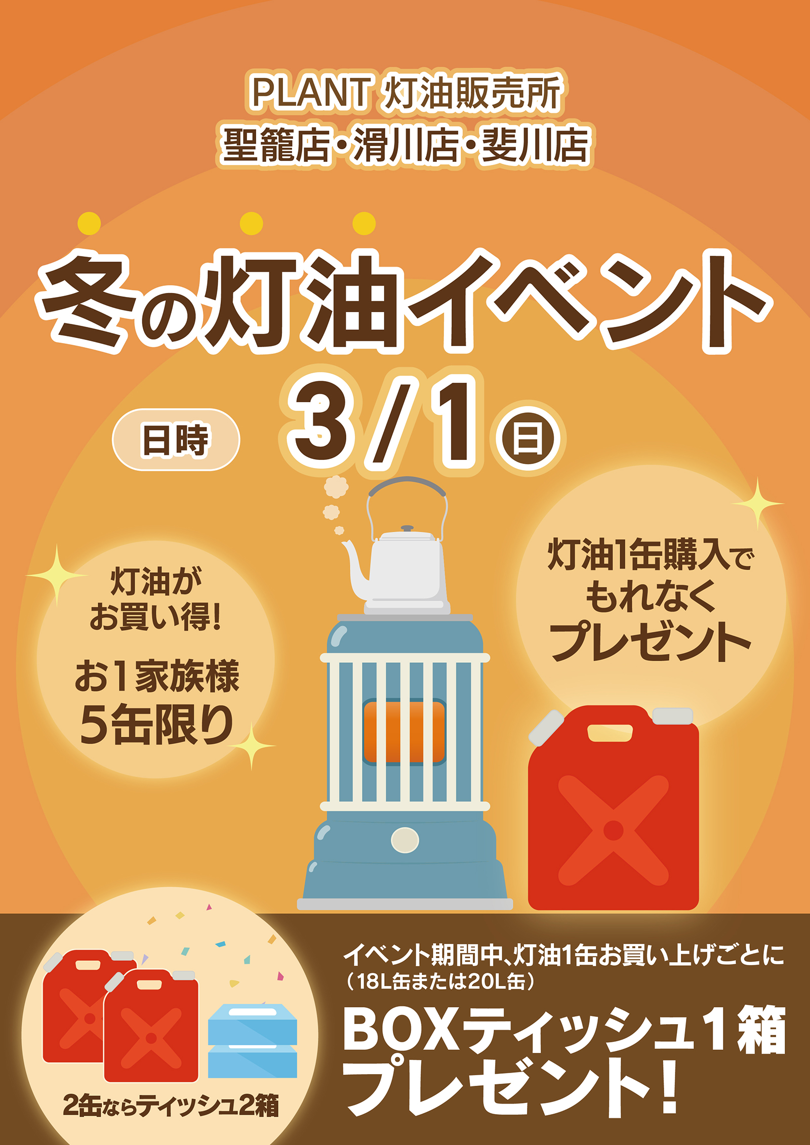 【聖籠店・滑川店・斐川店】3/1(日)は、灯油がお得!