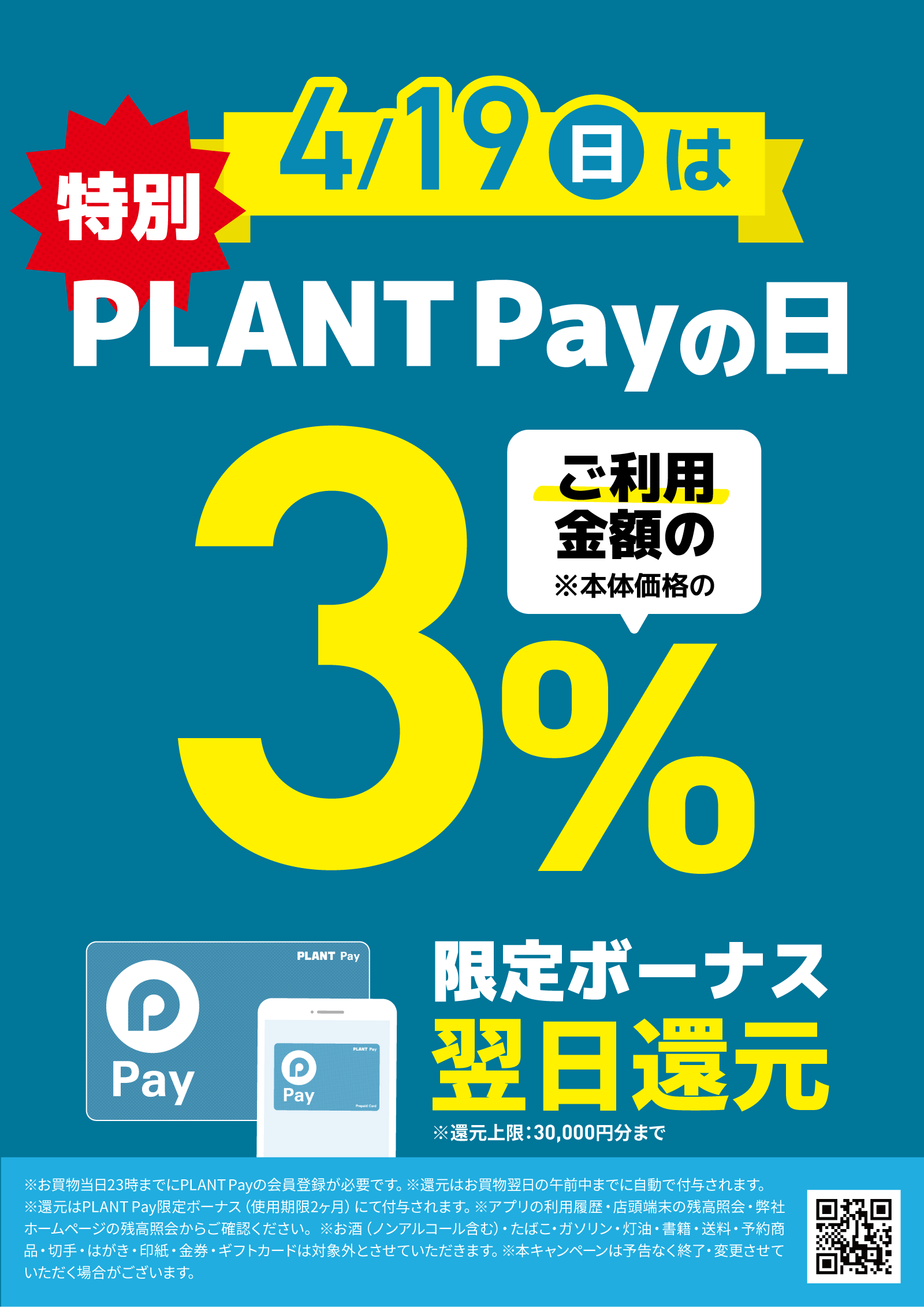 4/19(日)は「PLANT Payの日」PLANT Payのご利用で、翌日3%還元!