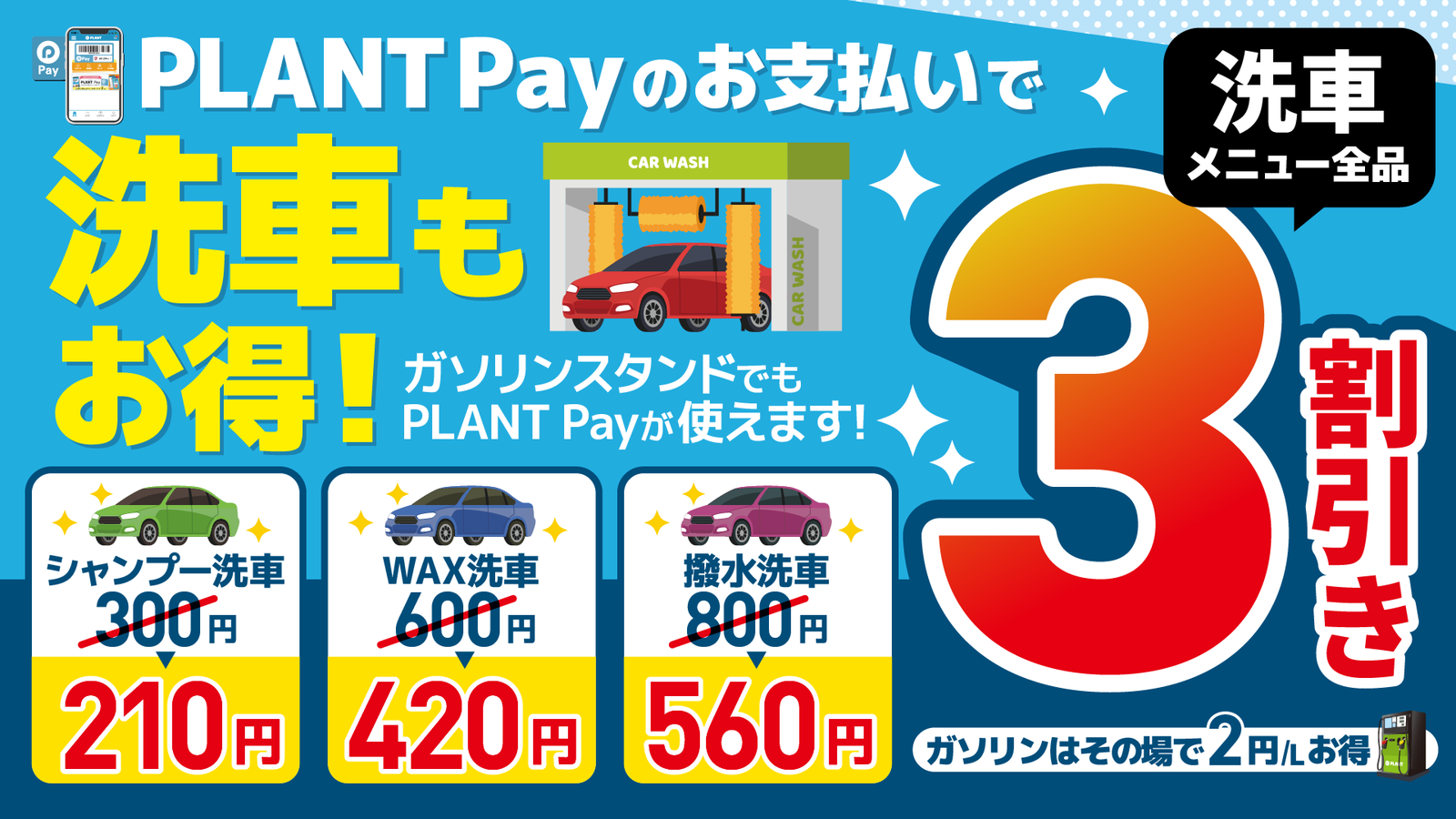 チャージするたびにチャージボーナスがもらえるPLANTのお得な電子マネー「PLANT Pay」は、PLANTガソリンスタンドでもお得にご利用いただけます。PLANT Payでのお支払いで、ガソリン・灯油が表示価格より2円/L引きで給油できるほか、ドライブスルー洗車が全メニュー3割引き[※]でご利用いただけます。もちろん給油機でのチャージも可能です。