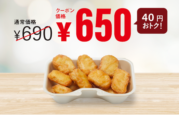 メニュー画面左下に表示される「クーポンを使う」から対象商品を選んでご注文ください。